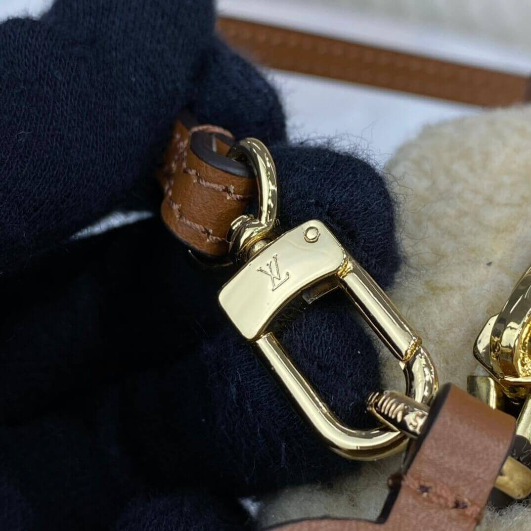 For the LV Teddy special edition, Louis Vuitton's Beach Pouch is transformed into a chic winter accessory in fluffy shearling. An elaborate intarsia technique is used to create a giant LV in tones of beige and brown. A name tag and shoulder strap complete this design.