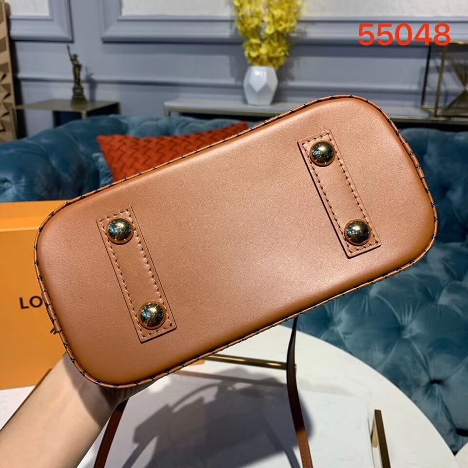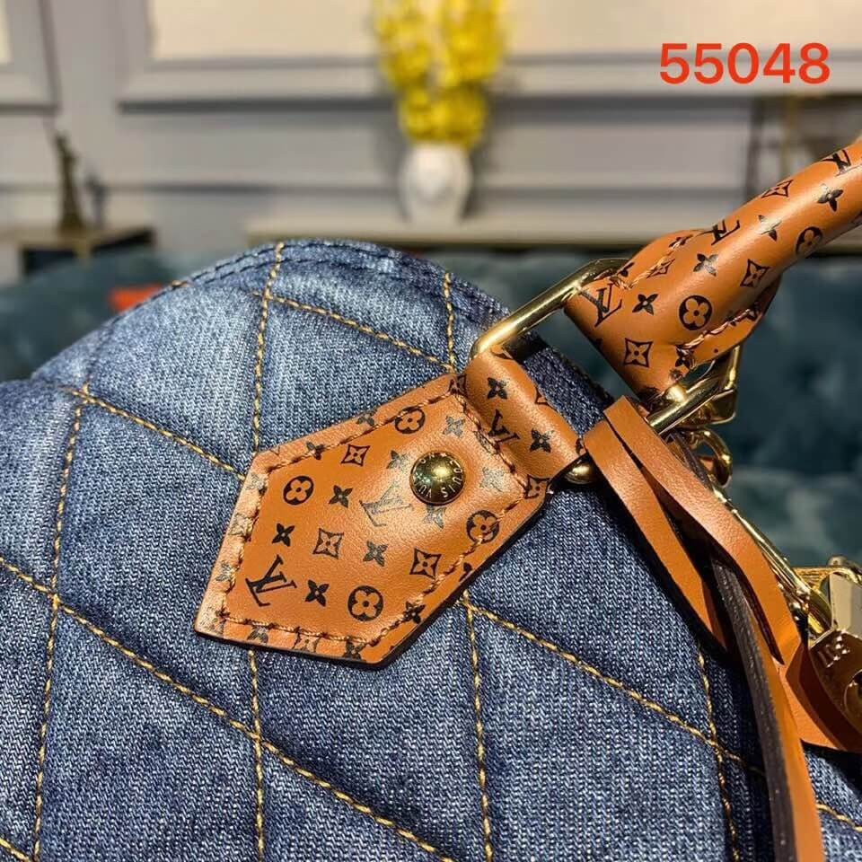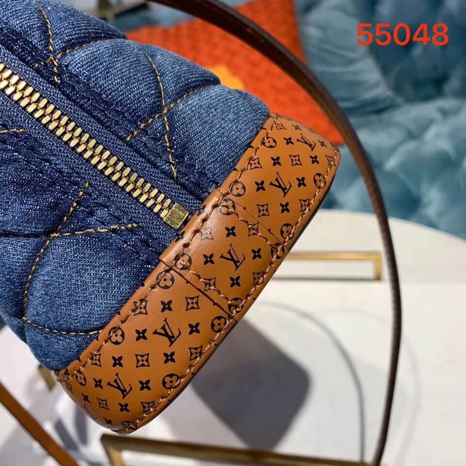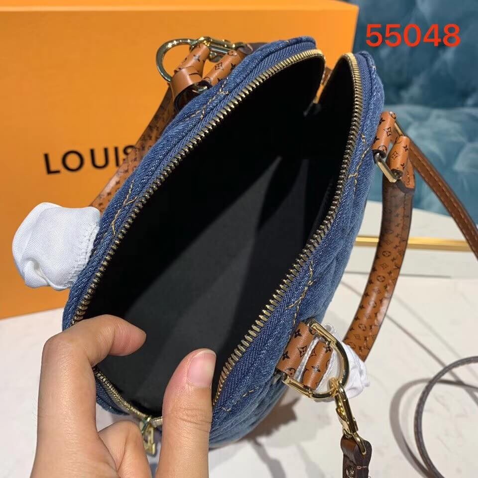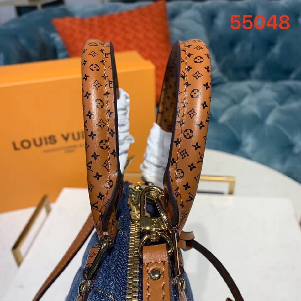 The timeless Alma BB handbag is updated for Pre-Fall 2019 with Malletage-quilted dark denim canvas. The tan calf-leather handles and trim are printed with a minuscule Monogram motif, a playful signature touch. The charming BB size can be styled in a multitude of ways: carried by hand, slung over a shoulder or worn cross-body.