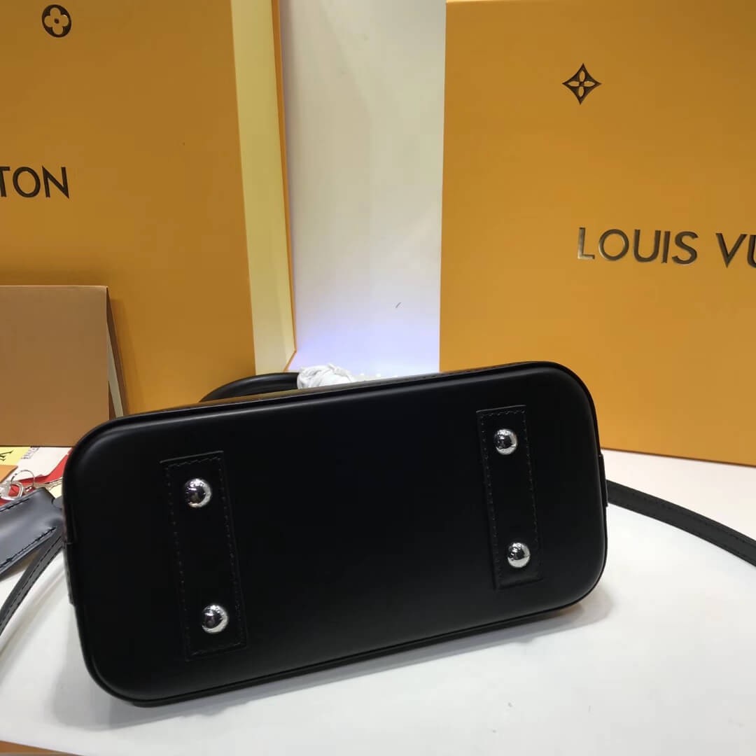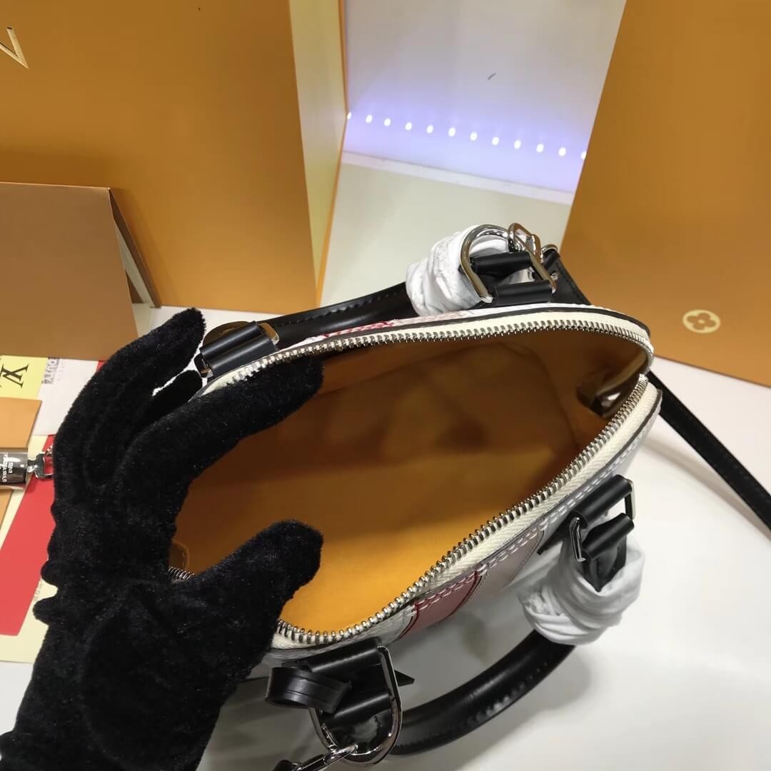 This Alma BB handbag is crafted of grained Epi leather with smooth leather trim and two eye-catching stripes. The two-tone stripe, a theme seen on shoes at the Fall 2018 Collection, is a nod to the House’s trunk making and personalization Heritage. Playful but practical, it easily holds keys, wallet, smartphone and lipstick. The removable strap brings versality to the Alma BB, which can also be worn over the shoulder or across the body.