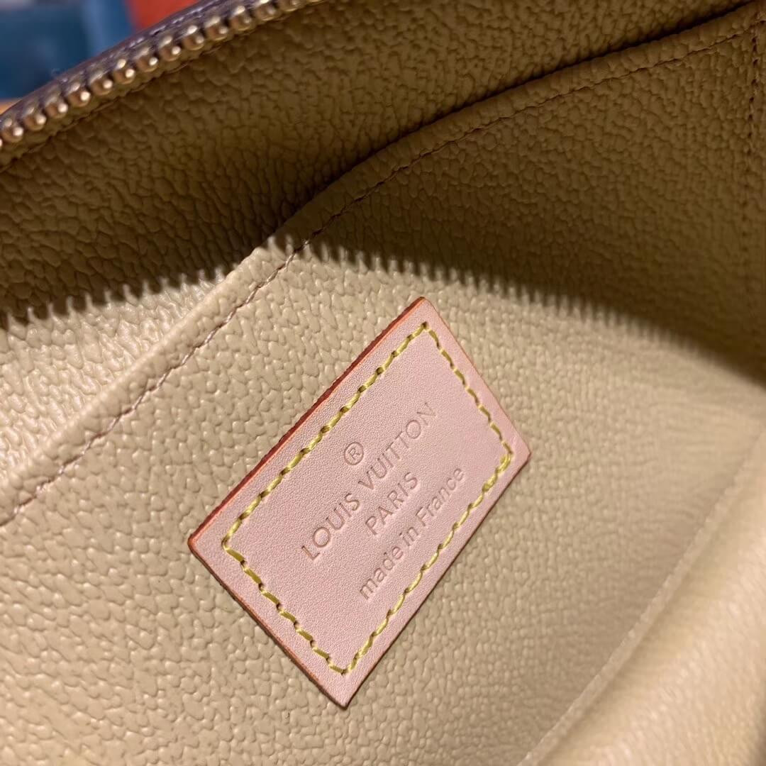 This compact cosmetic pouch in Monogram canvas slips easily into a handbag or suitcase. Its round shape and flat base facilitates access to small products.