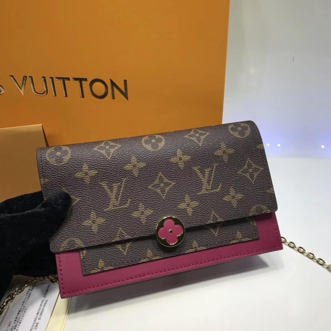 Combining Monogram canvas and calf leather, the Flore chain wallet features a distinctive clasp in the shape of a Monogram Flower. This feminine design is large enough to hold a smartphone as well as other everyday essentials, and can be carried as a clutch, on the shoulder or across the body.