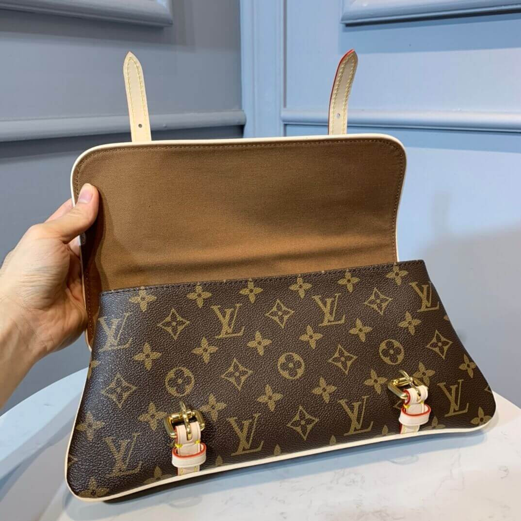 - Coated canvas exterior, flap top with buckle closures, shoulder straps
