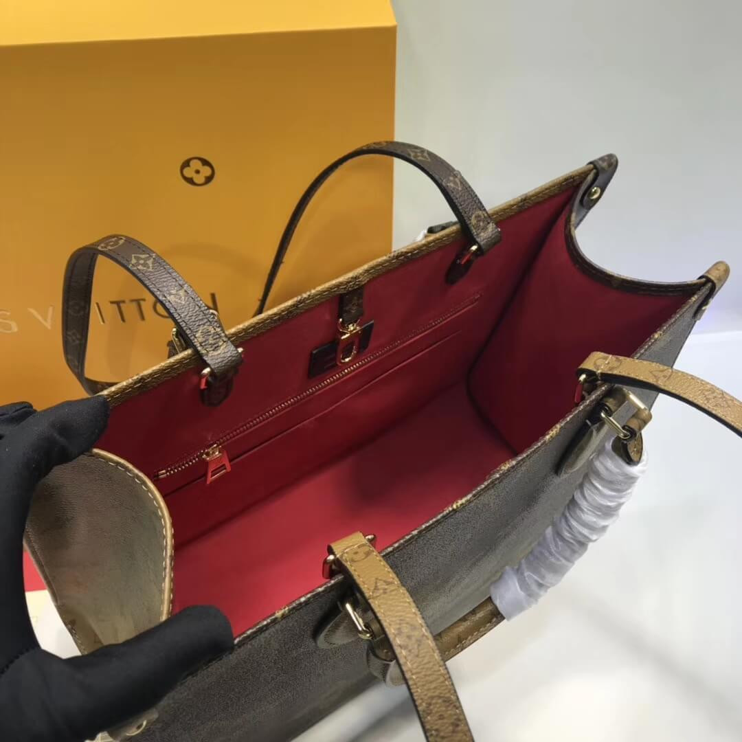 The name says it all: Onthego MM takes care of business or shopping, with plenty of room for a busy woman’s essentials. With classic Monogram canvas on one side and Monogram Reverse on the other, it is virtually two bags in one. Twin Toron top handles and two shoulder straps offer several different carry styles, for extra versatility.