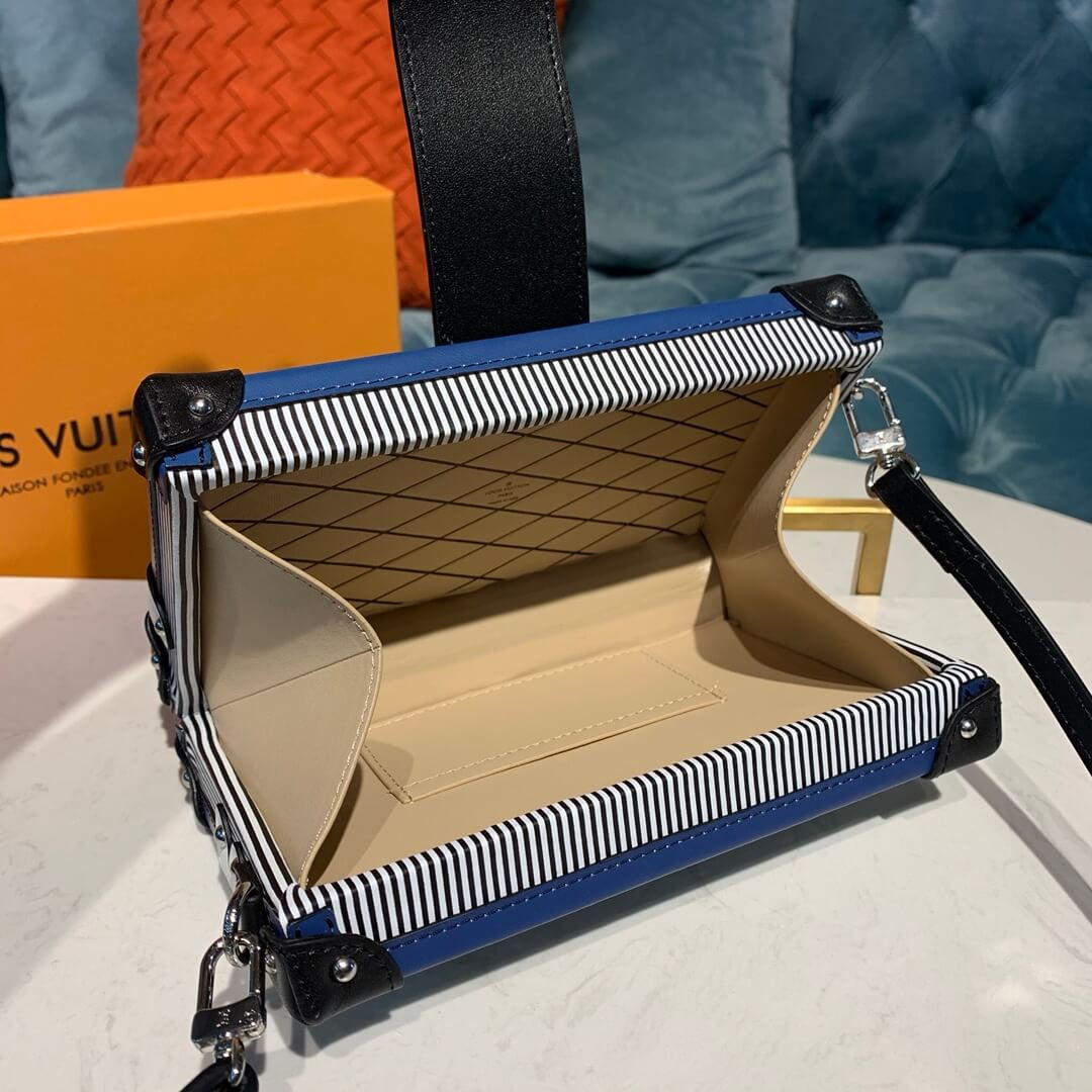 Hypnotic stripes and striking color combine on an eye-catching Petite Malle handbag, created for Spring-Summer 2019. The black-and-white vertical pattern is artfully spray-painted onto the leather of this impeccably crafted “little trunk,” which can be carried as a clutch or attached to its adjustable strap for shoulder or cross-body wear.