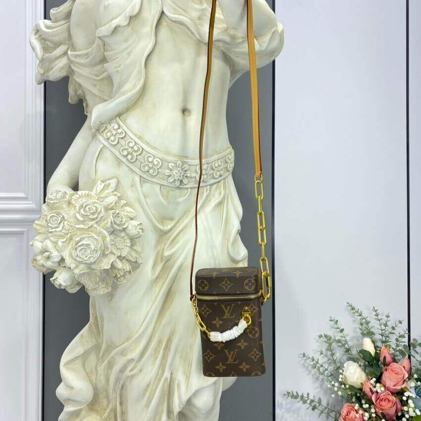 Virgil Abloh’s new Phone Box is a compact bag, perfect for carrying small essentials. Made from classic Monogram canvas with an adjustable strap in smooth leather, it features Abloh’s gold-color chain signature. Inside there’s a mini flat pocket for credit cards and a driver’s license.