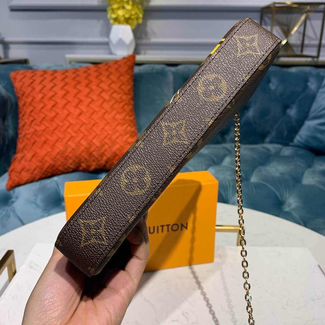 The Pochette Félicie in Monogram canvas is a stylish solution to carry and organize daily essentials. This versatile pouch features two removable pockets, including one with several card slots. It can be carried as a clutch or a shoulder bag thanks to a removable gold-tone chain.