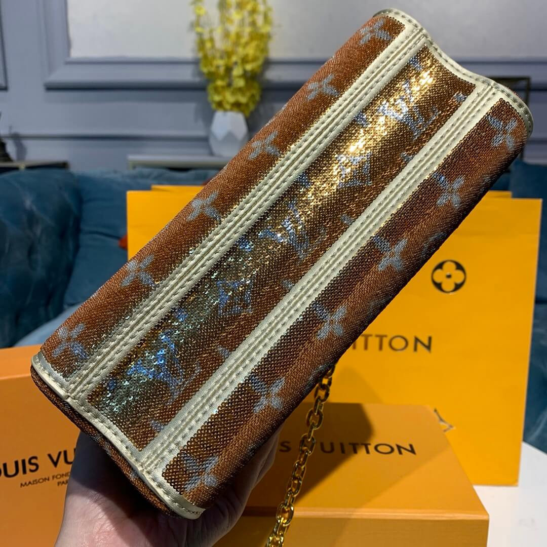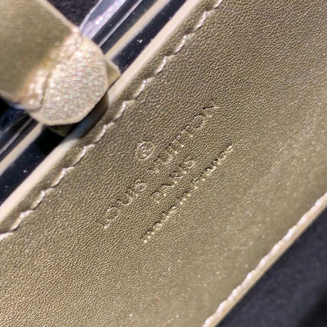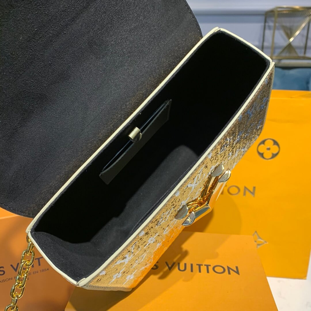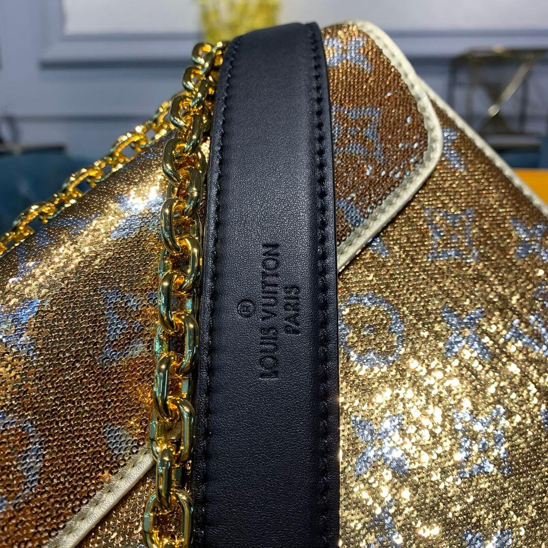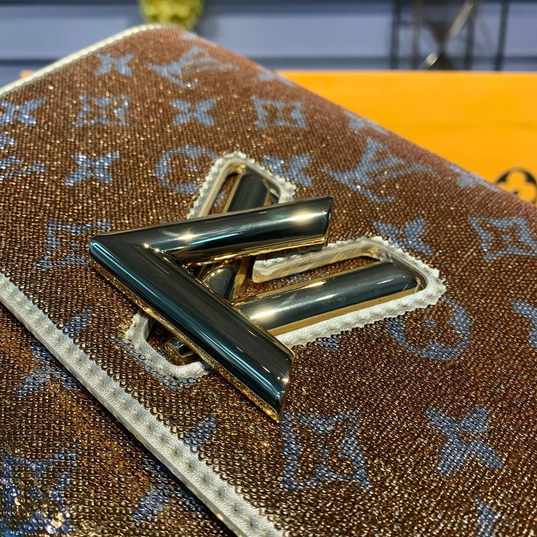 This exceptional edition of the emblematic Twist MM handbag combines Louis Vuitton's leather-goods craftsmanship with couture techniques. Smooth leather is densely embroidered with silver and gold-tone sequins to create a shimmering Monogram pattern. When this glamorous bag catches the light, the effect is mesmerizing.