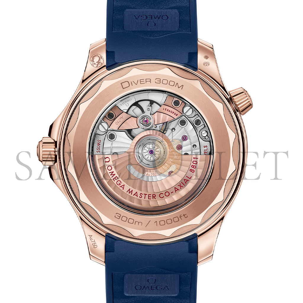 The watch is presented on a blue rubber strap and is driven by the OMEGA Master Chronometer Calibre 8801, which can be seen through the sapphire-crystal on the wave-edged caseback.