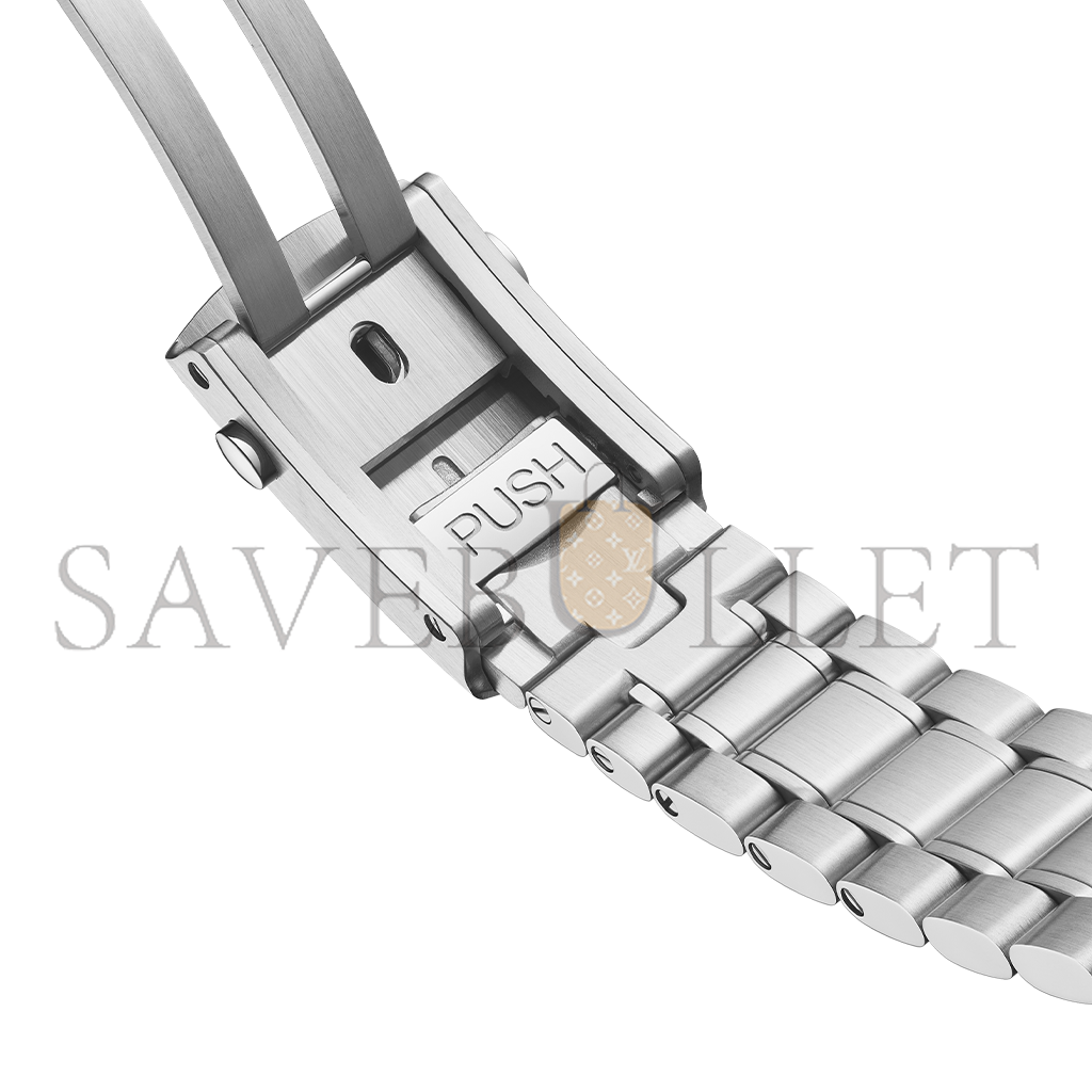 On the white dial, there is a distinctive racing style minute-track which gives the watch its name. There are also two subdials with blackened applied rings as well as a 6 o��clock date window that blends with the colour of the dial. The hour and minute hands and arrowhead indexes are blackened with white Super-LumiNova. Orange touches include the "Speedmaster" name and the tip of the central seconds hand.