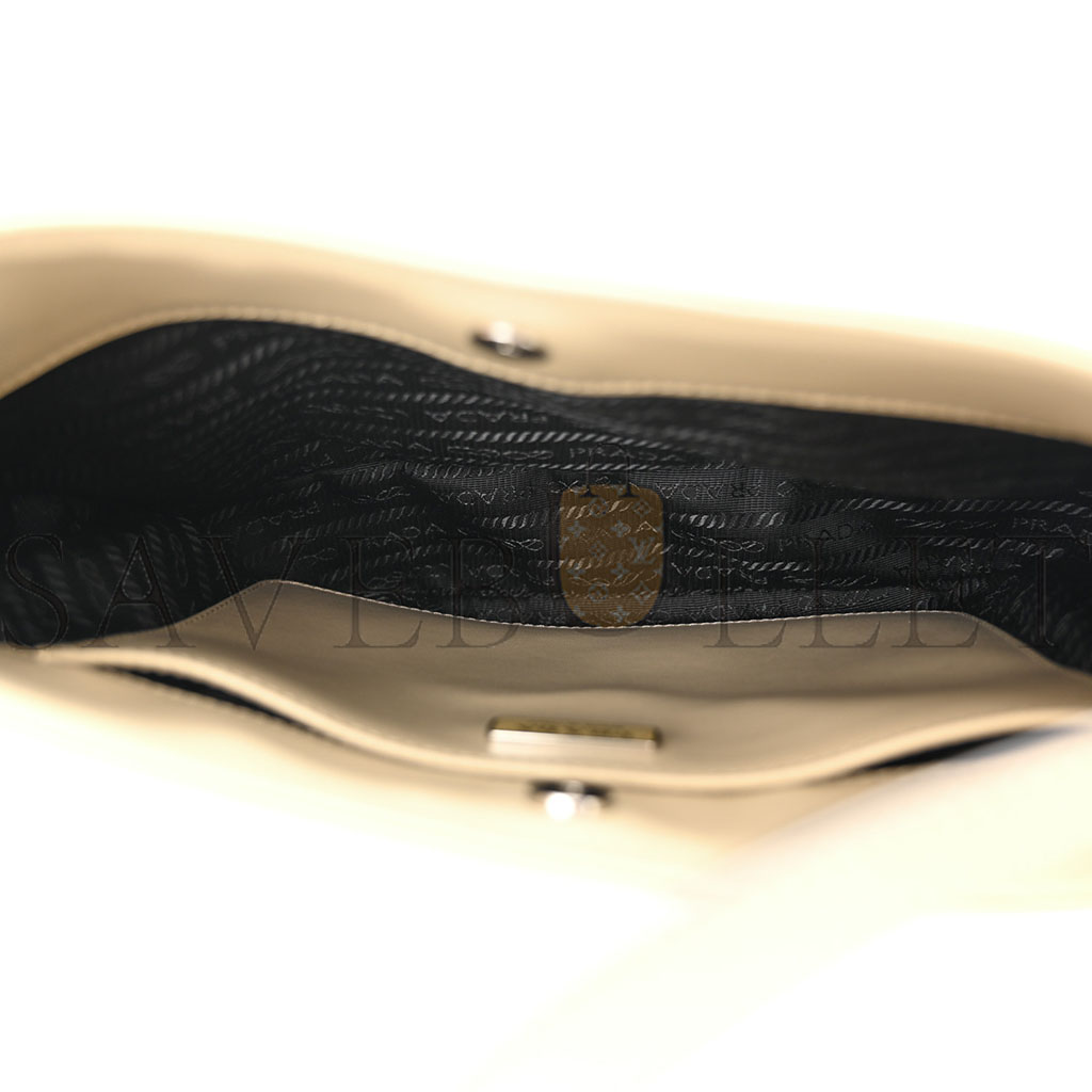 This is an authentic PRADA Brushed Calfskin Cleo Shoulder Bag in Desert Beige. This stylish bag is crafted of smooth beige calfskin leather. The magnetic closure opens to a black fabric interior with a leather patch pocket.
