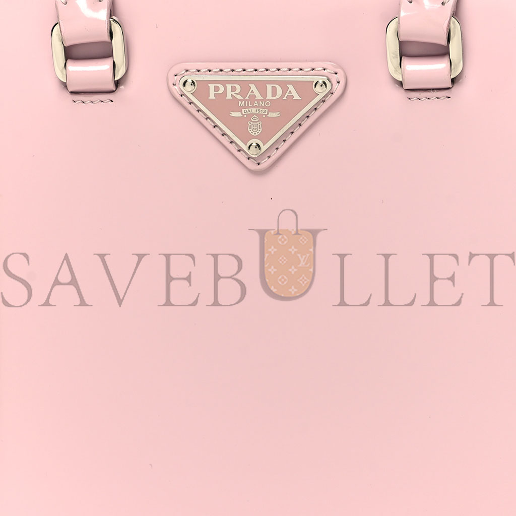 This is an authentic PRADA Brushed Calfskin Small Tote Bag in Alabaster Pink. This lovely tote is crafted of smooth polished calfskin leather in pink and features a large Prada logo plate on the front. This bag features rolled leather top handles and opens to a black satin interior with a patch pocket.