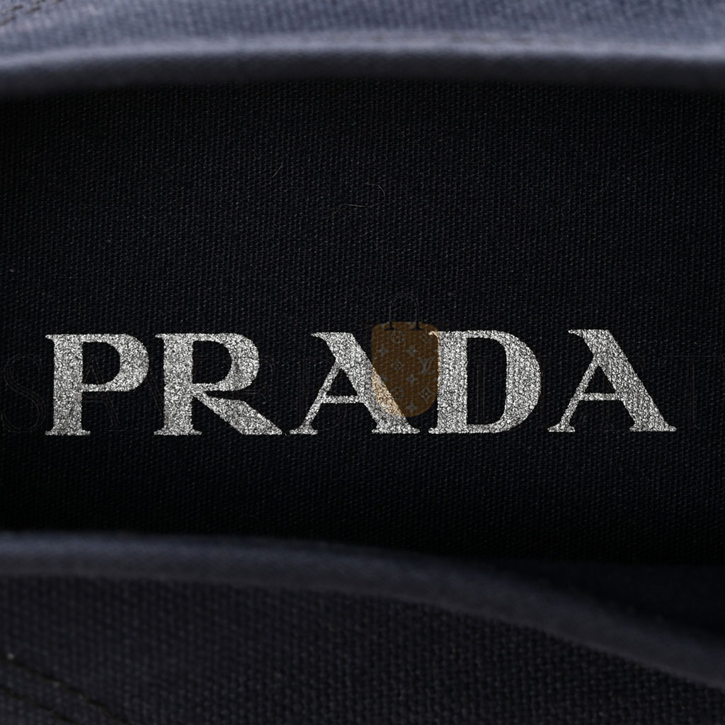This is an authentic pair of PRADA Canvas Triangle Logo Wheel 35mm Sneakers size 8 in Navy. These sneakers are crafted of navy blue canvas fabric and feature the Prada logo on the sides in white and thick white soles.
