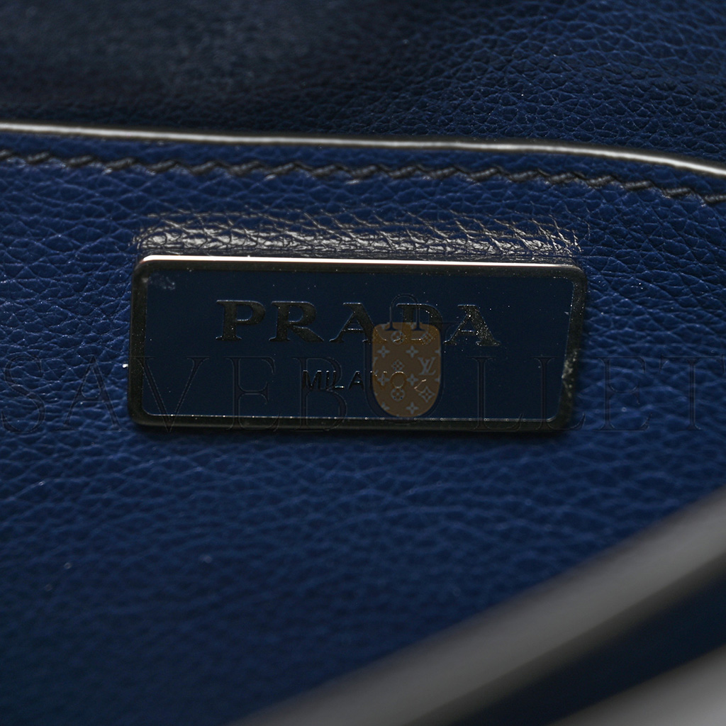 This is an authentic PRADA Glace Calf Shoulder Bag in Baltico. This stylish shoulder bag is crafted of luxurious calfskin leather blue. The bag features a magnetic snap closure, an adjustable shoulder strap, and a Prada logo on the front. The bag opens to a partitioned black fabric interior, with a patch pocket.