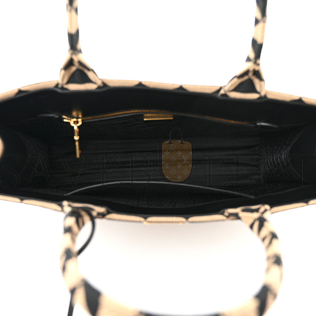 This is an authentic PRADA Jacquard Saffiano Triangolo Symbole Embroidered Large Tote in Black and Corda. This large tote is crafted of woven jacquard fabric with black leather trim. The bag features rolled fabric top handles and an open top revealing a black monogrammed jacquard interior with a patch and zippered pocket.