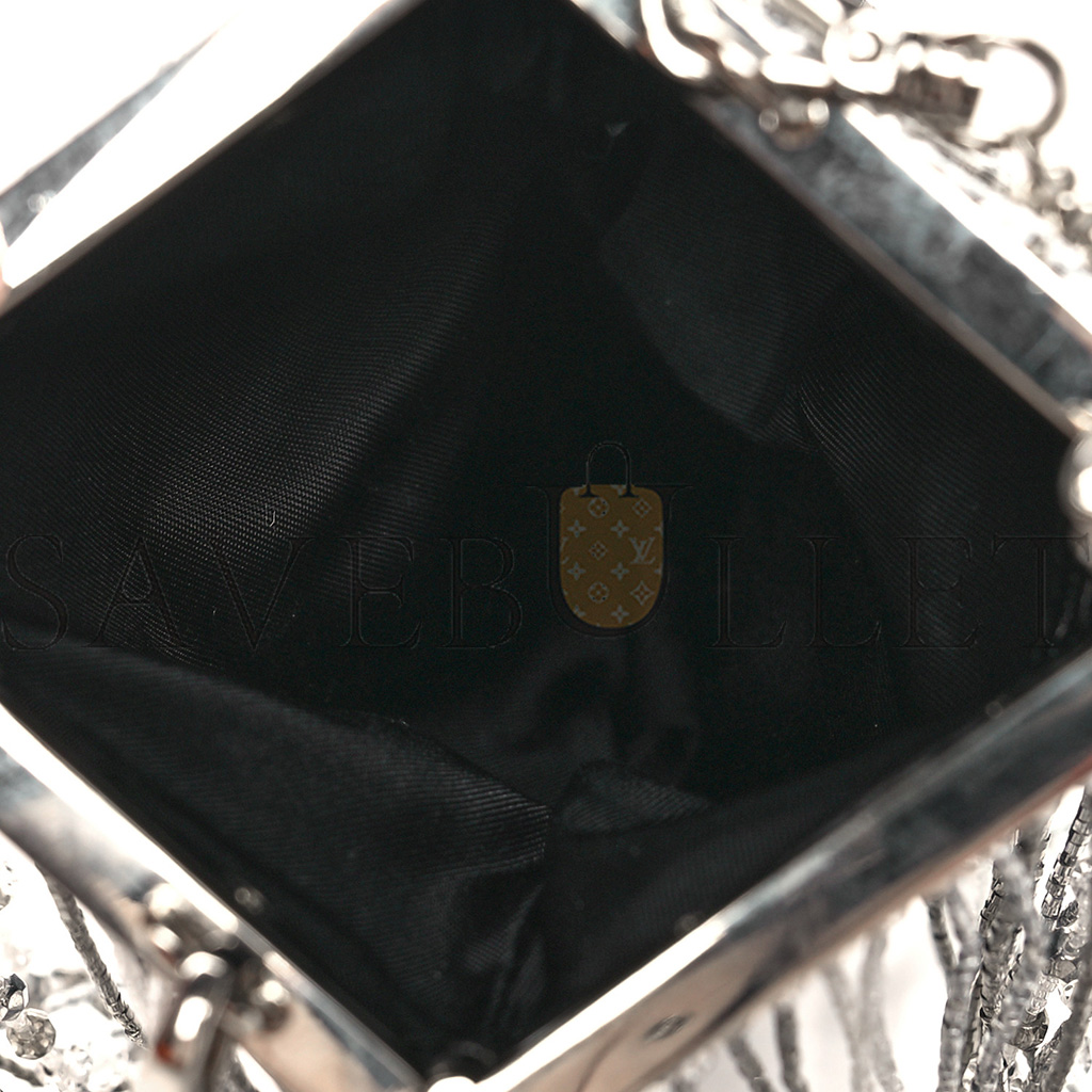 This is an authentic PRADA Nylon Beaded Fringe Flat Chain Clutch in Black. This chic clutch is made of black nylon and features fringe bead embellishments surrounding the bag.�The top zipper opens to a satin interior with zipper and patch pockets.