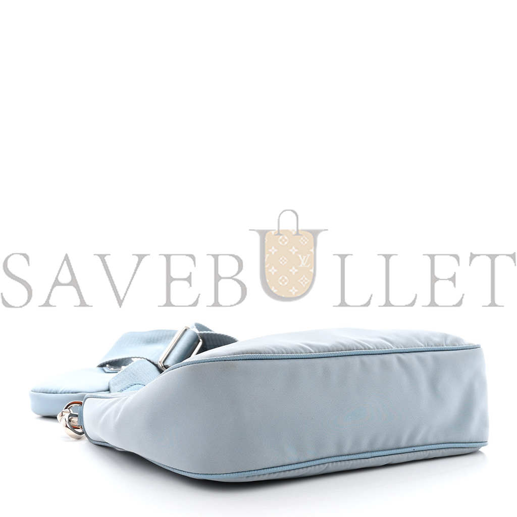 This is an authentic PRADA Nylon Re-Edition 2005 Shoulder Bag in Astrale. This petite messenger bag is crafted of fine light blue nylon with polished silver hardware. It features saffiano cross-grain leather trim, an adjustable light blue nylon crossbody strap, a silver chain strap, and a removable pouch. The top zipper opens to a matching Prada monogram jacquard interior.