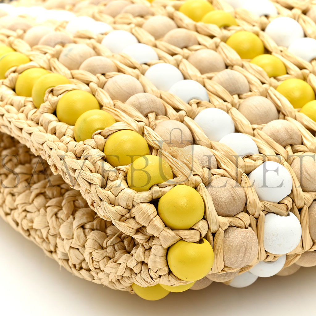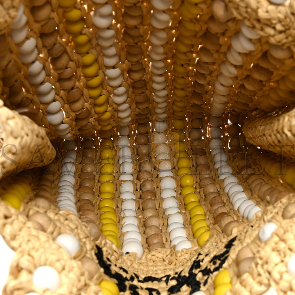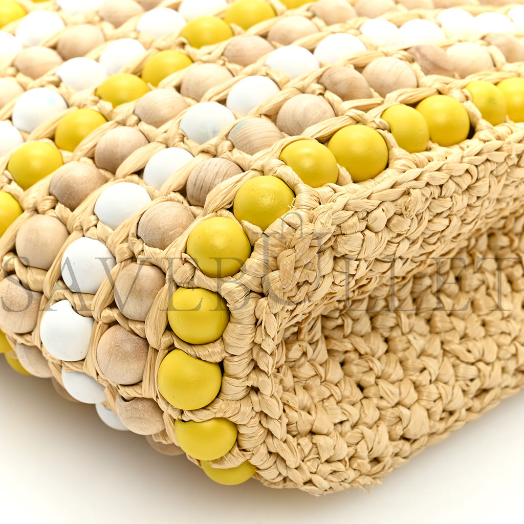 This is an authentic PRADA Raffia Embroidered Wood Beaded Logo Tote Bag in Tan. This is uniquely structured and beautifully crafted of fine, tightly woven raffia with an embroidered logo.