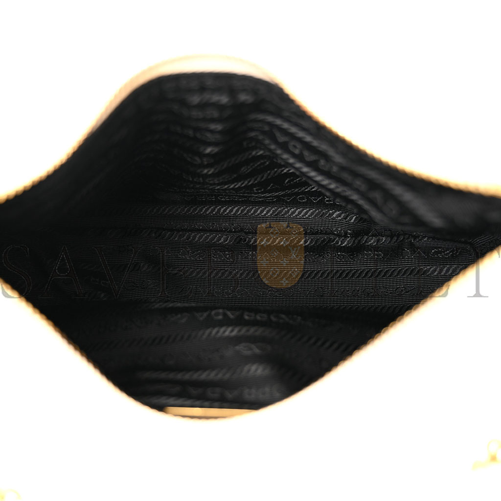 This is an authentic PRADA Saffiano Re-Edition 2005 Shoulder Bag in White. This shoulder bag is crafted of Prada signature saffiano crossgrain leather in white. The set features an adjustable white nylon shoulder strap, an optional gold chain-link strap, polished gold hardware and a removable coin purse. The top zipper opens to a black Prada monogram jacquard fabric interior.