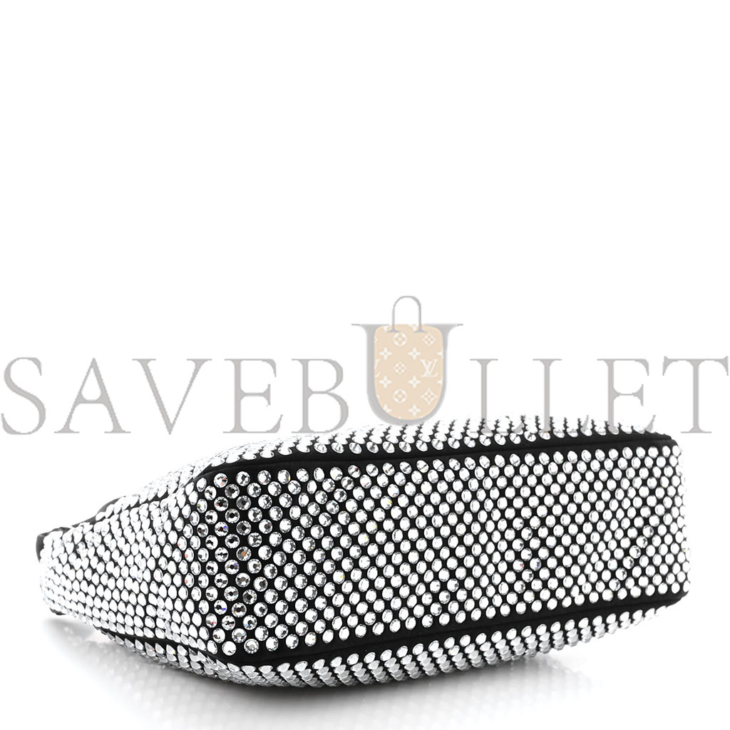 This is an authentic PRADA Satin Crystal Mini Re-Edition 2000 Bag in Black. This Prada handbag is crafted of crystal embellished black satin with silver hardware. The bag features a black nylon shoulder strap and the top zipper opens to a black satin interior.