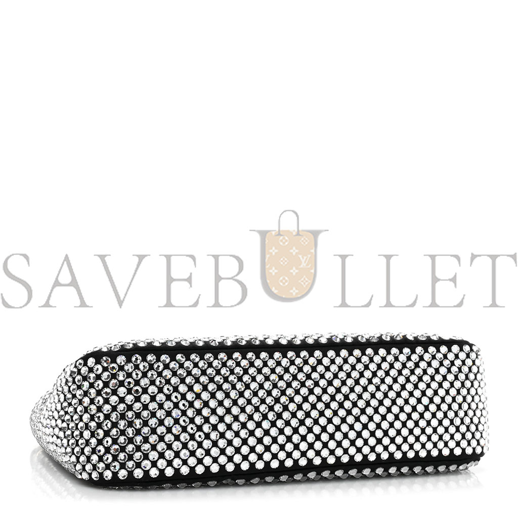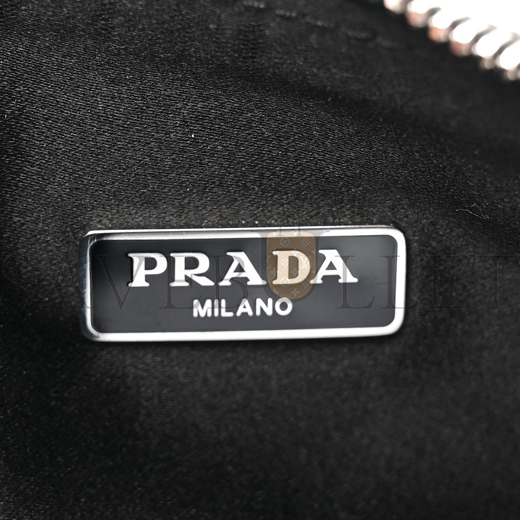 This is an authentic PRADA Satin Crystal Re-Edition 2005 Shoulder Bag in Cristal. This Prada handbag is crafted of crystal-embellished black satin with silver hardware. The bag features a black nylon shoulder strap, a silver chain strap and the top zipper opens to a black satin interior.