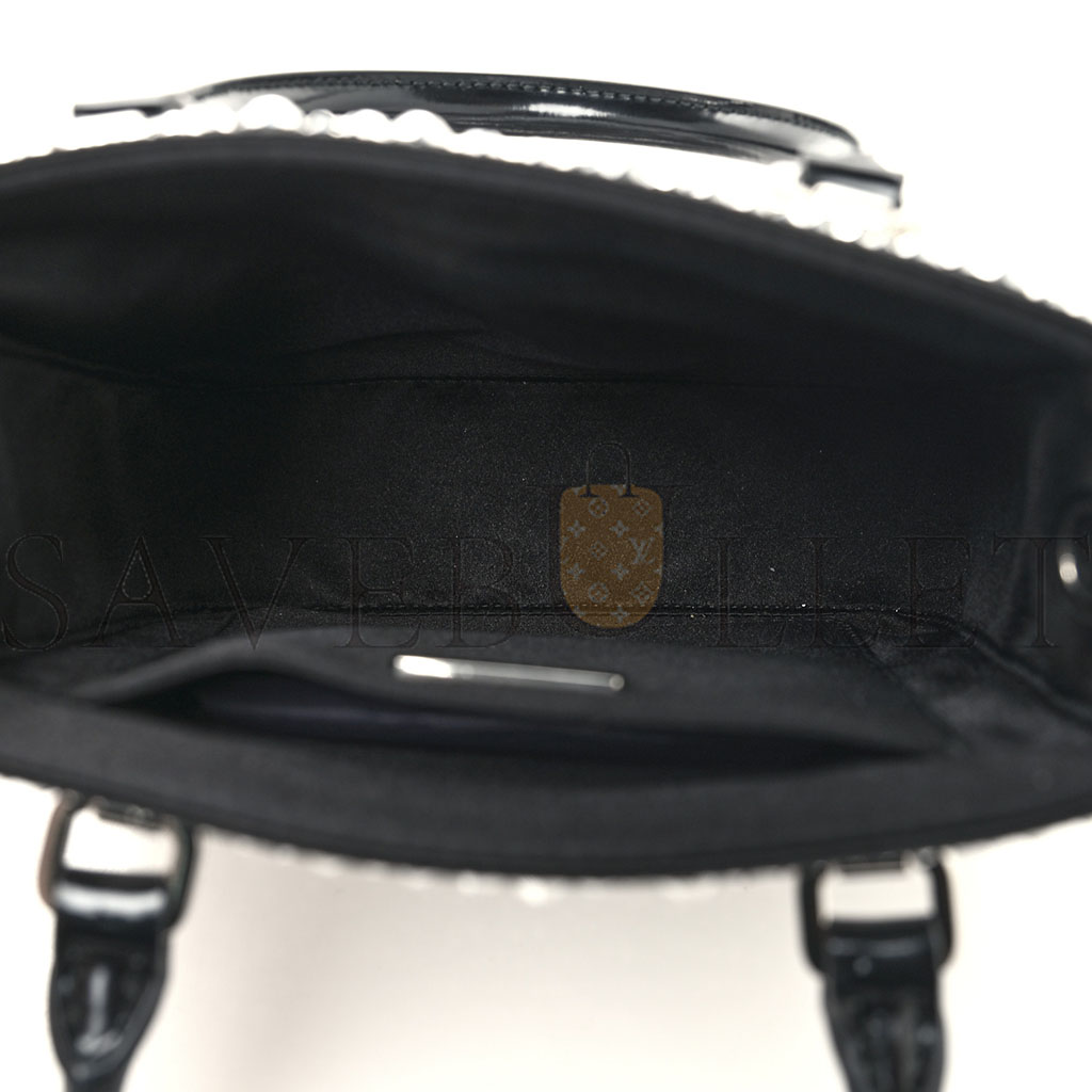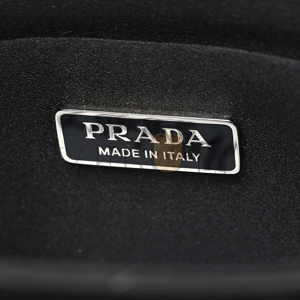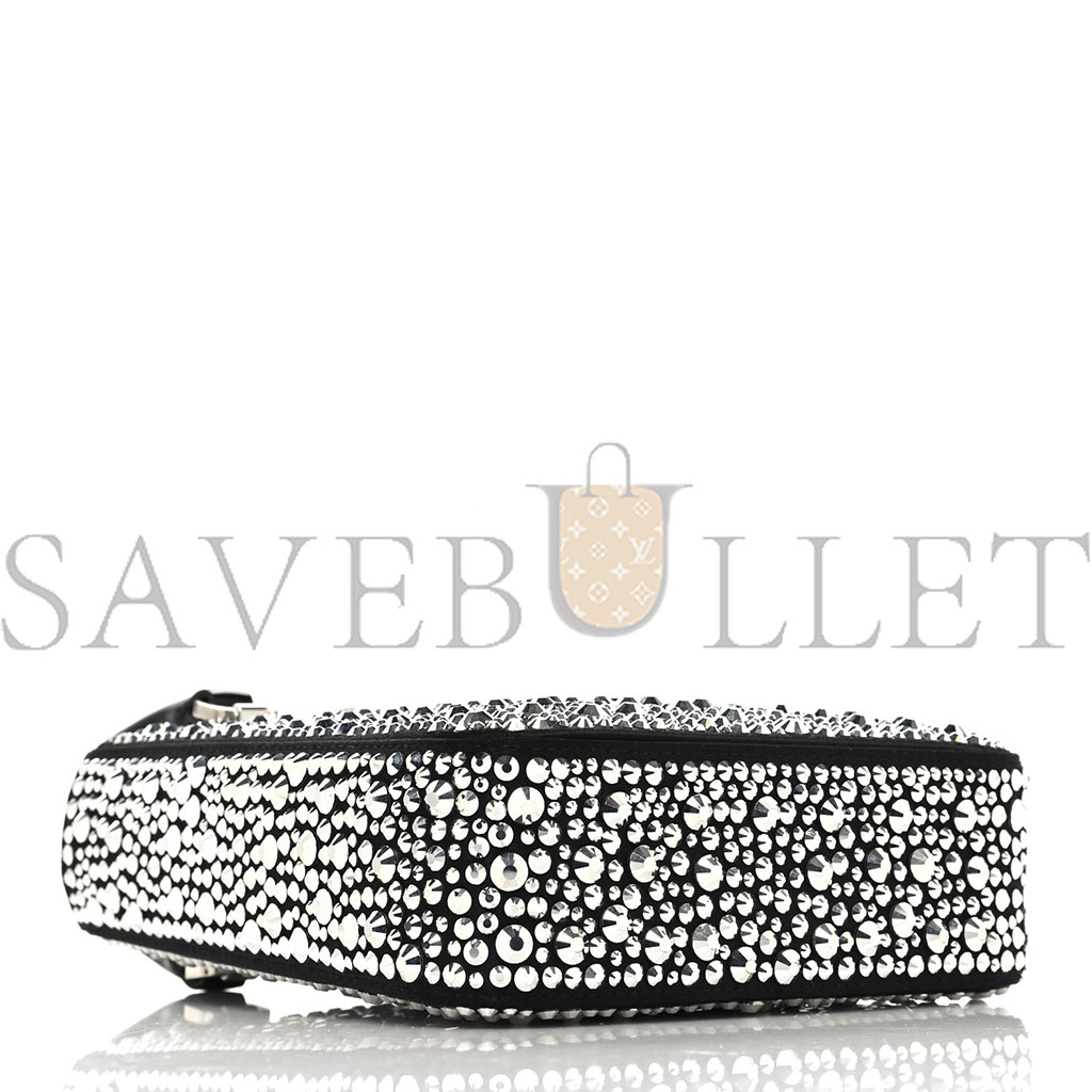 This is an authentic PRADA Satin Crystal Small Tote Bag in Metal. This stylish bag is crafted of black satin with silver sequins stones throughout the bag. This bag features black leather top handles, optional adjustable black leather shoulder strap, and silver hardware. The open top leads to a black satin interior with a patch pocket.