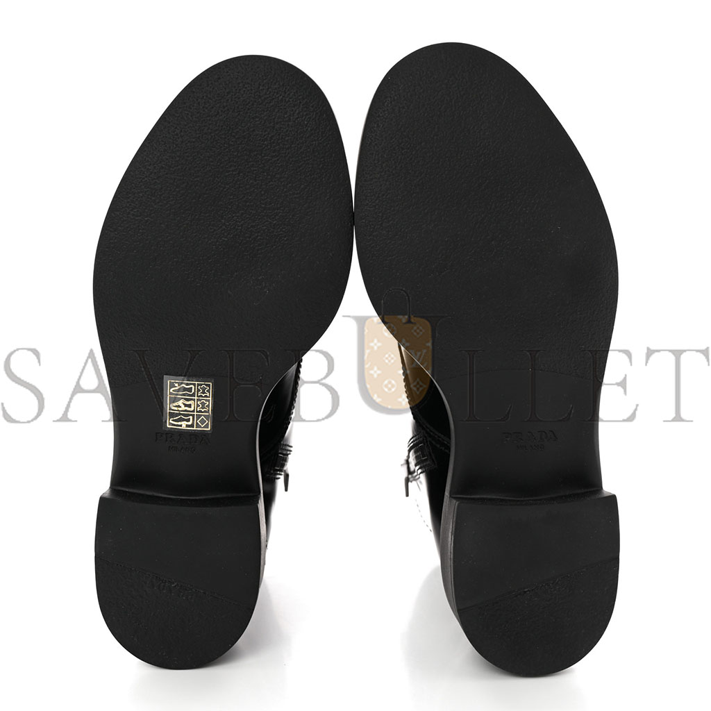 This is an authentic pair of PRADA Spazzolato Chocolate 50mm Combat Boots size 36 in Black. These chic platform boots are crafted of black polished calfskin leather. They feature black stacked rubber platform soles.
