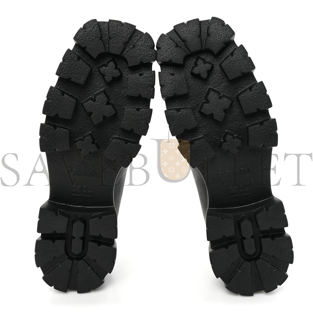 This is an authentic pair of PRADA Spazzolato Mens Lace Up 45mm Derby Loafers size 8 in Black. These derby lace-up shoes are crafted of smooth black calfskin leather with chunky rubber soles.