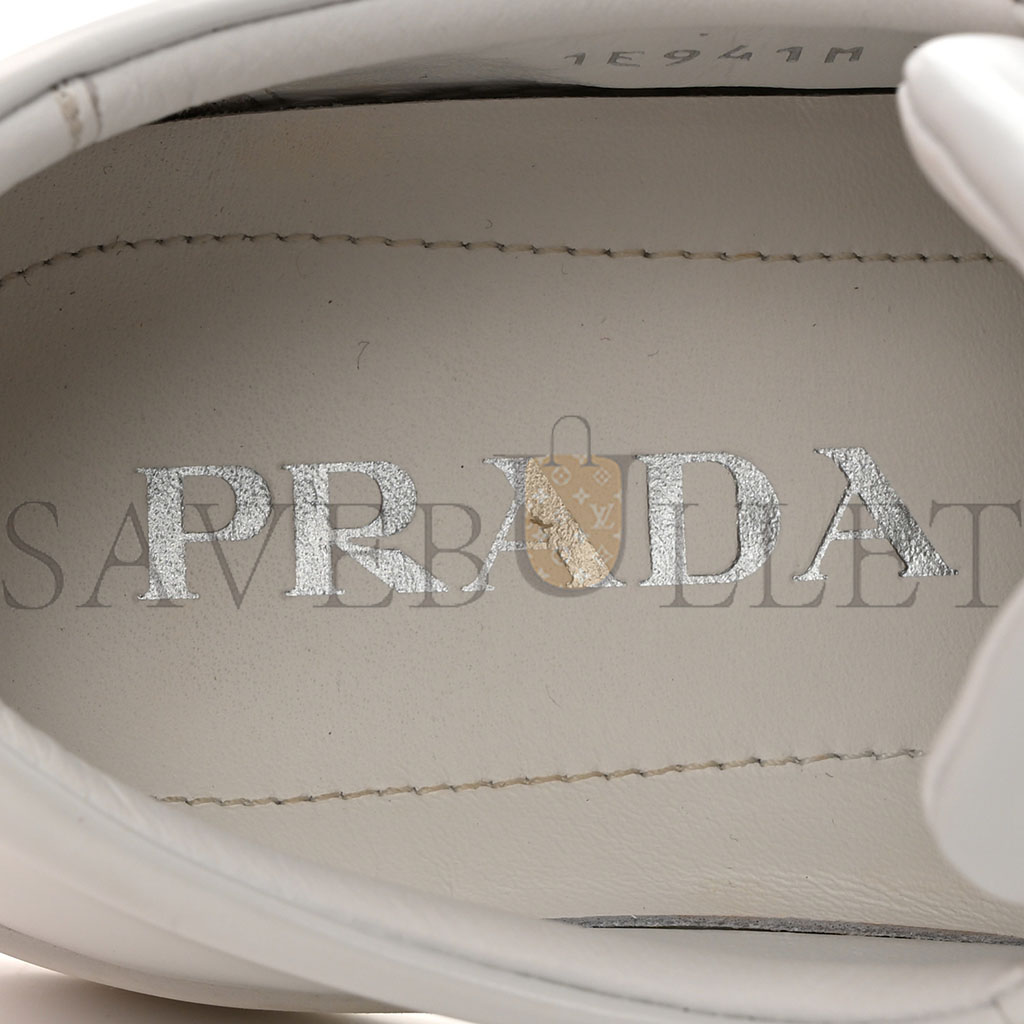 This is an authentic pair of PRADA Spazzolato Rois Metal Triangle Logo 25mm Sneakers size 35.5 in White and Soleil. These sneakers are crafted of smooth white leather and feature the Prada triangle logo printed on the sides in yellow, white laces, and white rubber soles.
