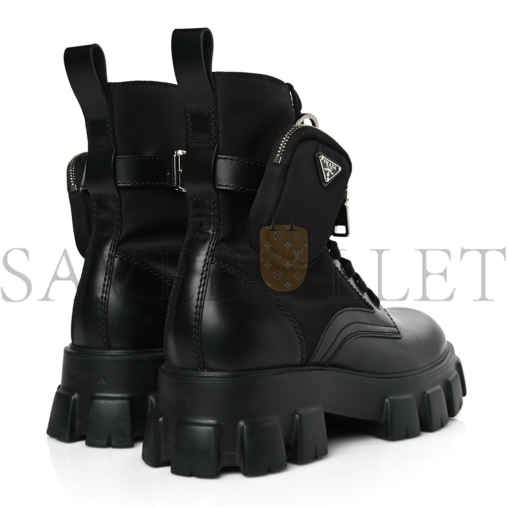 This is an authentic pair of PRADA Spazzolato Rois Re-Nylon Metal Triangle Logo Mens Monolith Pouch Pocket 60mm Combat Boots size 9.5 in Black. These combat boots are crafted of calfskin leather and nylon in black. They feature black stacked rubber platform soles, crossover straps, and removable pouches.