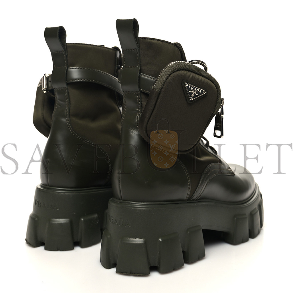 This is an authentic pair of PRADA Spazzolato Rois Re-Nylon Metal Triangle Logo Monolith Pouch Pocket 55mm Boots size 40.5 in Militare. These chic platforms are crafted of green nylon and calfskin leather. They feature green stacked rubber platform soles, crossover straps, and removable pouches.