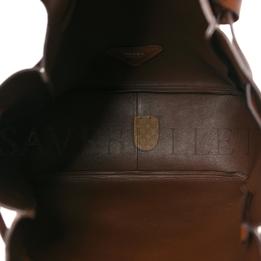 This is an authentic PRADA Vitello Daino Flou Dynamique Tote Cognace. This stylish handbag is crafted of luxuriously textured calfskin leather in brown. The bag features looping leather top handles and the top opens to a brown leather interior.
