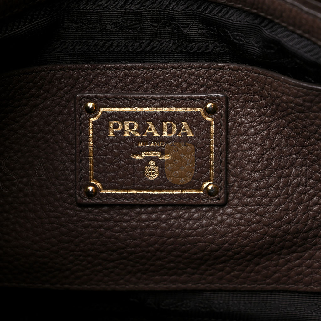 This is an authentic�PRADA Vitello Daino Shopping Tote in Palissandro. This stylish tote is crafted of finely textured calfskin leather in brown. The bag features rolled leather top handles, an optional shoulder strap and polished gold hardware. The top is open to a matching Prada name logo jacquard fabric interior with zipper and patch pockets.