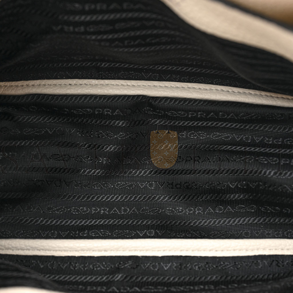 This is an authentic PRADA Vitello Daino Top Handle in White. This bag is crafted of grained white leather. The bag features a white leather rolled handles, a leather and logo jacquard shoulder straps with silver hardware. The top zipper opens to a black Prada logo jacquard interior.
