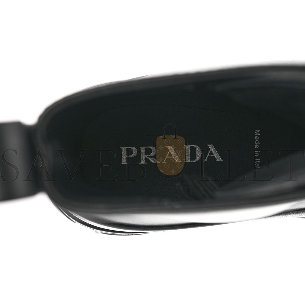 This is an authentic pair of PRADA Vitello Mens Lug Sole 45mm Combat Boots size 9 in Black. These men's boots are crafted of calfskin leather in black. They feature black rubber lug soles, squared toes, and black laces.