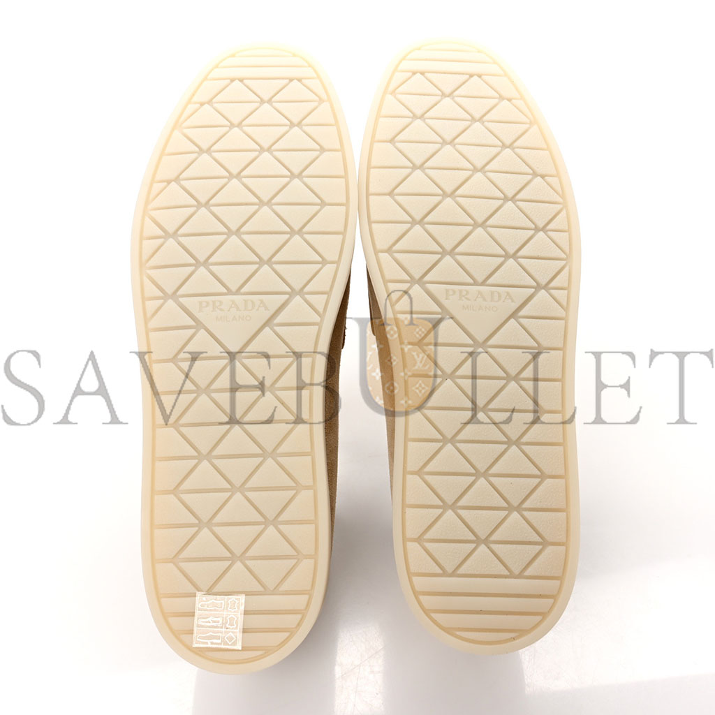 This is an authentic pair of PRADA Vitello Scamosciato Metal Triangle Logo Saint Tropez 25mm Loafers size 40 in Ecru. These chic loafers have rubber bottoms with tan natural suede leather and ivory leather insoles.
