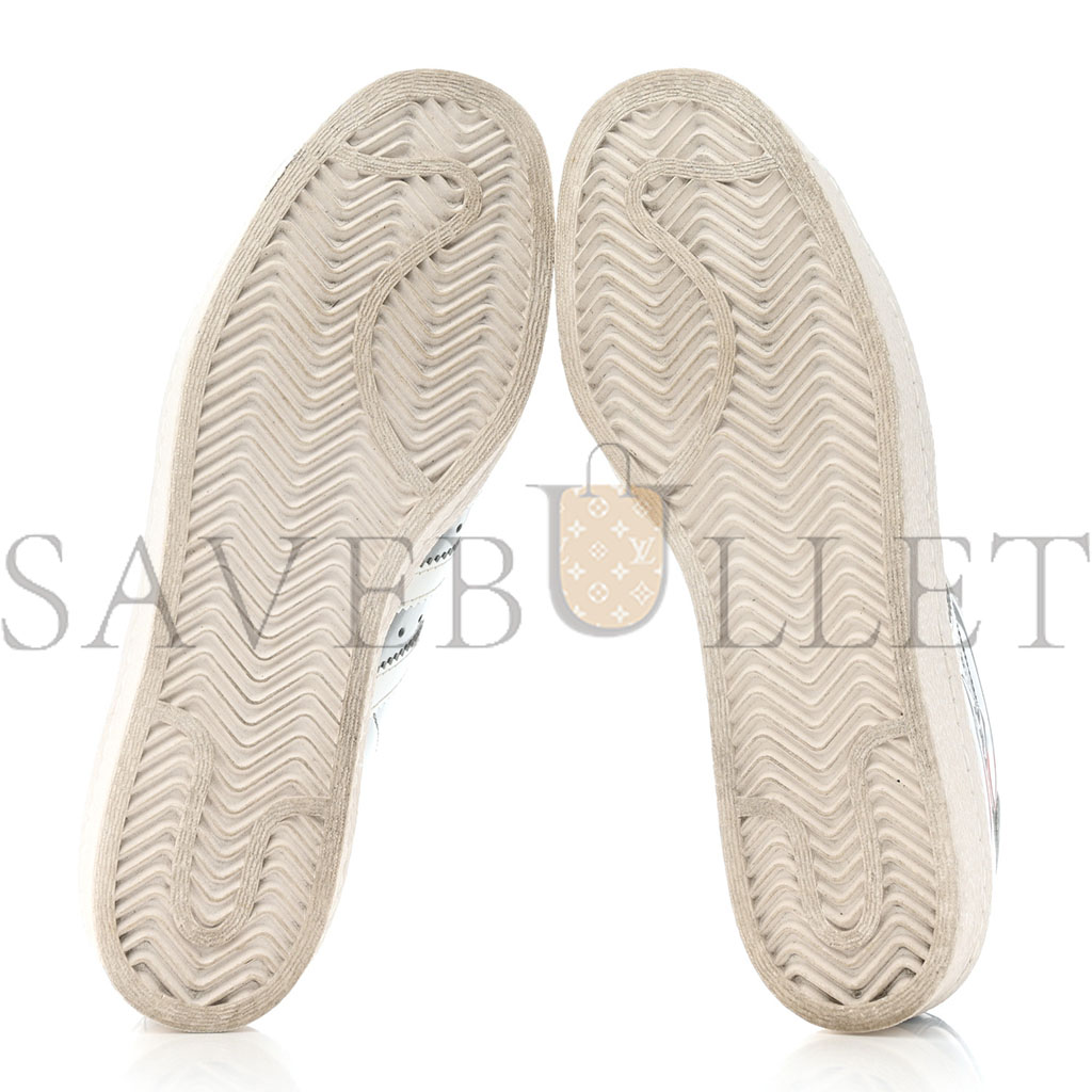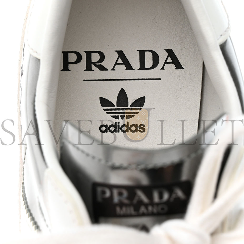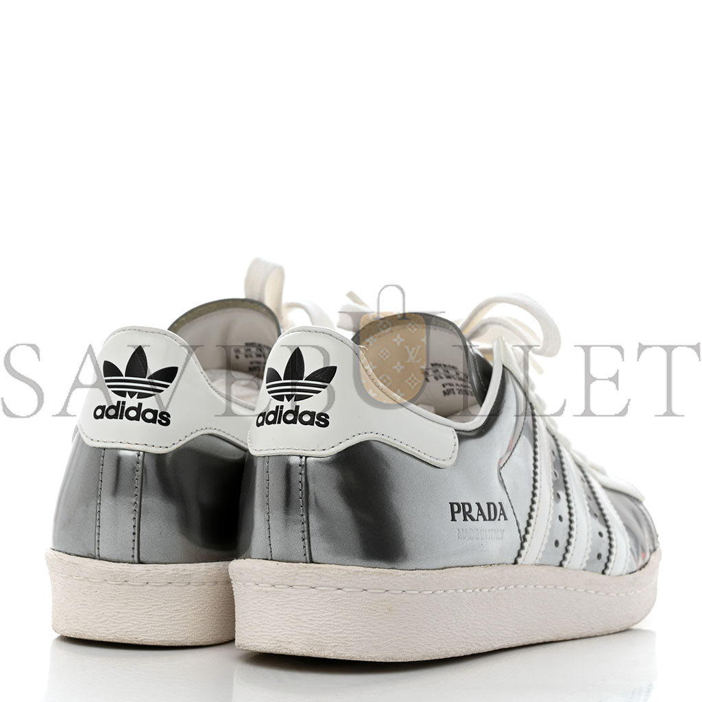 This is an authentic pair of PRADA X ADIDAS Brushed Calfskin Logo Mens Superstar Sneakers size 6 in White and Silver. These stylish sneakers are crafted of white and silver with white rubber soles.