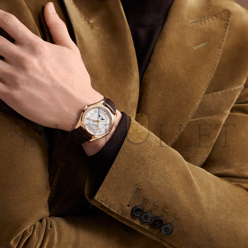 Heir to a model from 1956, this 18K pink gold watch features a precision moon phase that is accurate over 122 years. This poetic complication is finished with day, date, and month displays. The date display and hand are embellished with a blue that matches the moon disc. Its openworked caseback reveals an elevated oscillating weight in 22K gold, inspired by the Maltese cross.