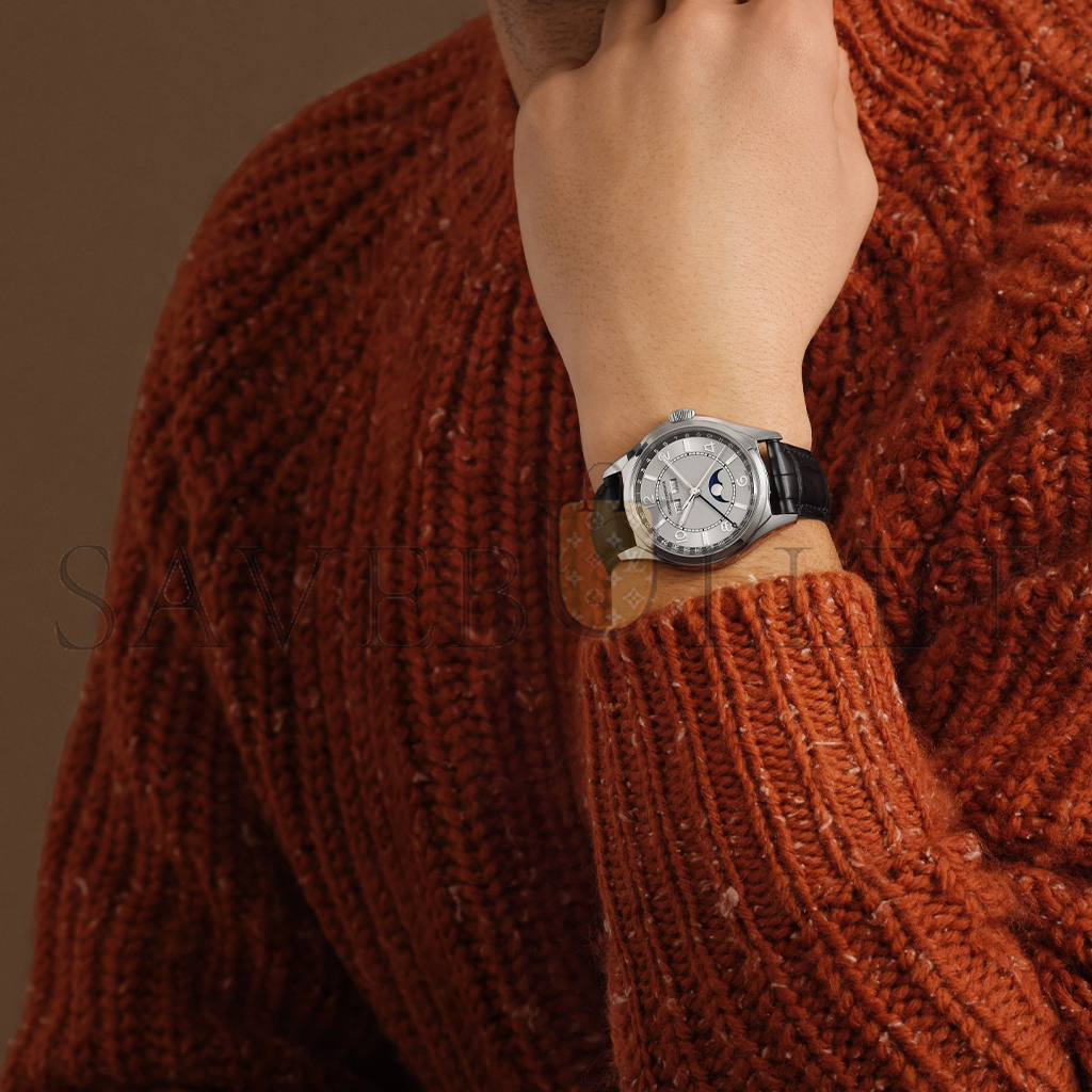 Heir to a model from 1956, this steel watch features a precision moon phase that is accurate over 122 years. This poetic complication is finished with day, date, and month displays. Embellished with blue, the date hand and the moon phase disc contrast elegantly with the silver-toned dial. Its openworked caseback reveals an elevated oscillating weight in 22K gold, inspired by the Maltese cross.
