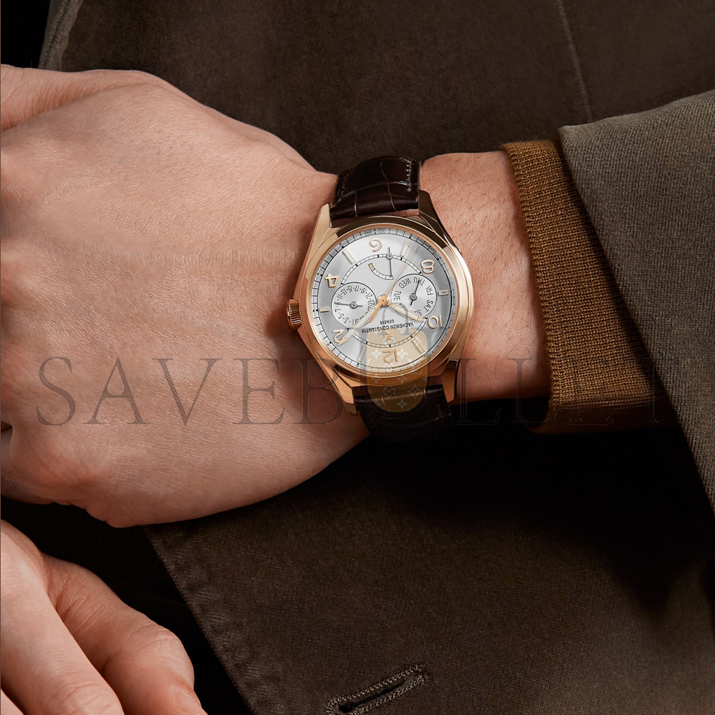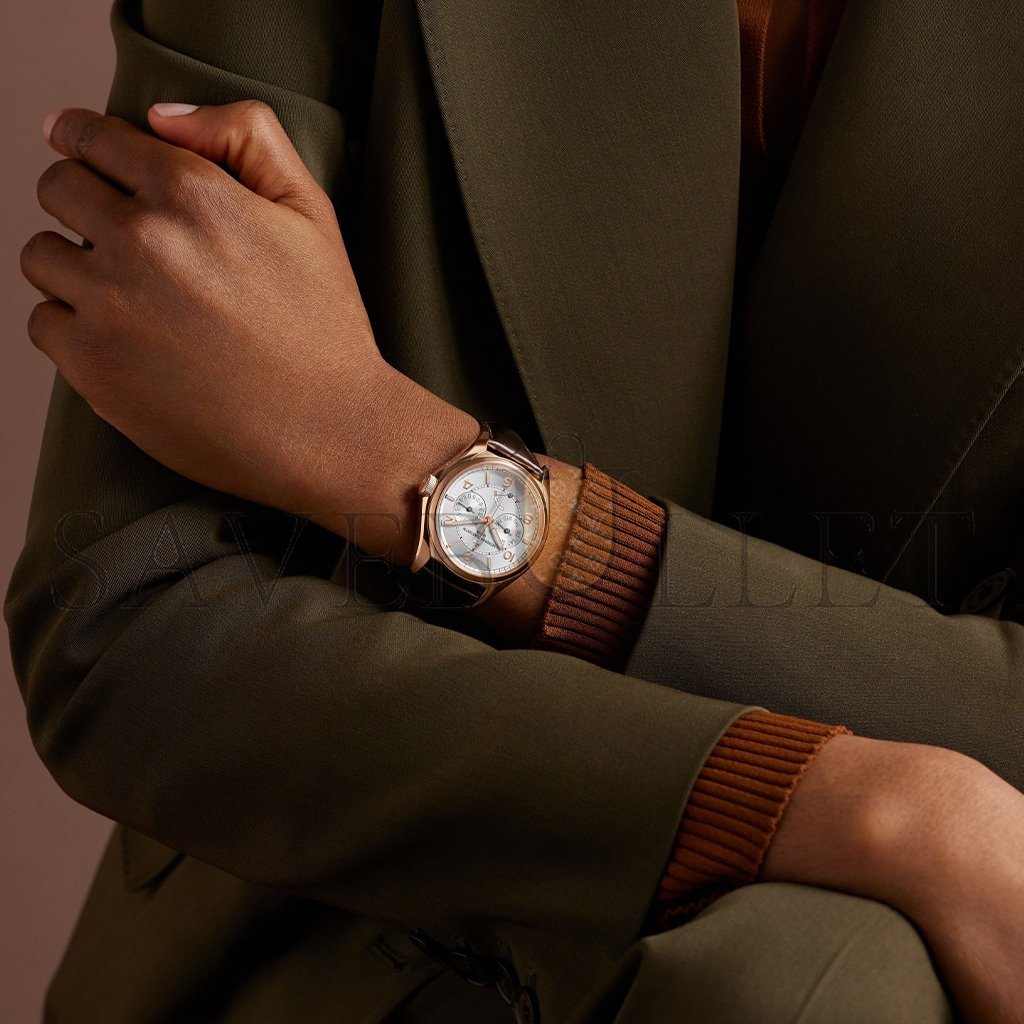 With horns inspired by the sides of the Maltese cross, an integrated crown, and sapphire glass, this 18K pink gold watch honors a model from 1956. It displays the power reserve, a day-date indicator, and seconds on the dial. Its openworked caseback reveals an elevated oscillating weight in 22K gold, inspired by the Maltese cross.