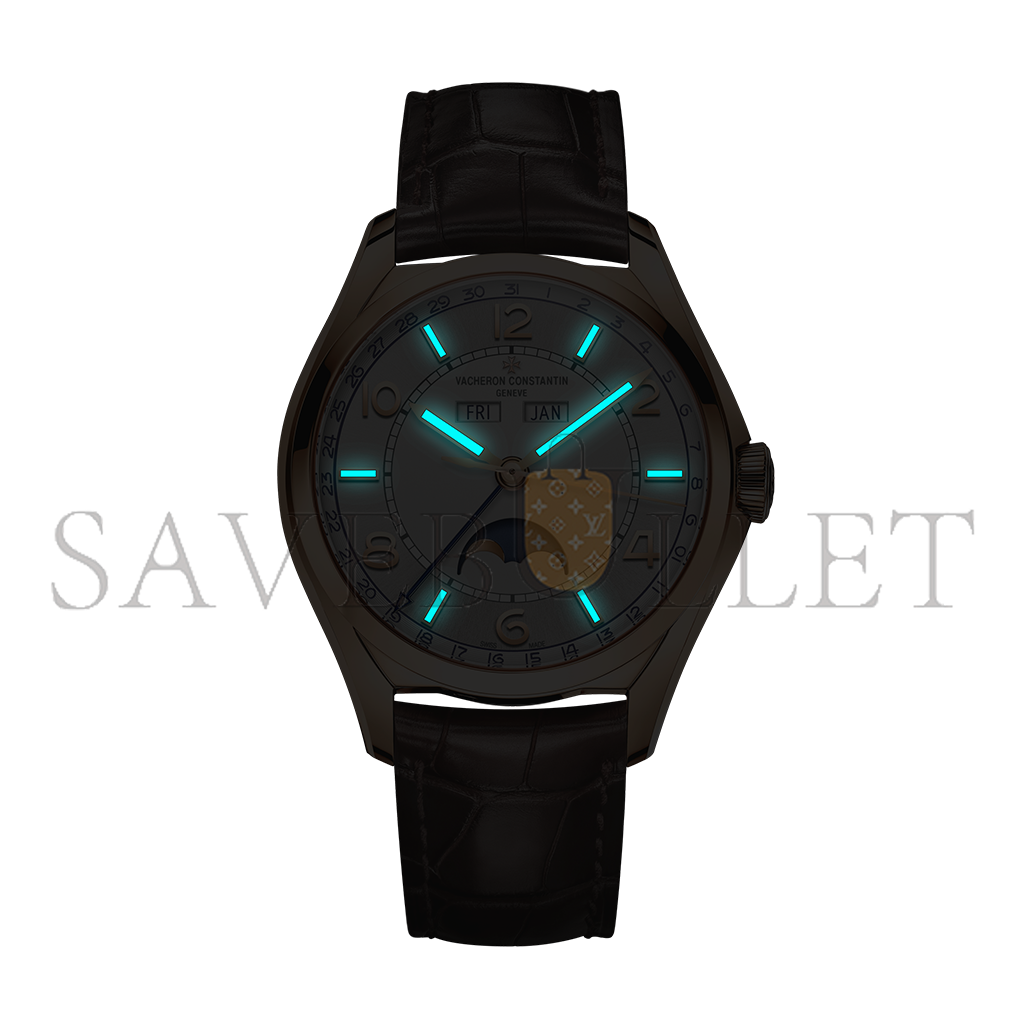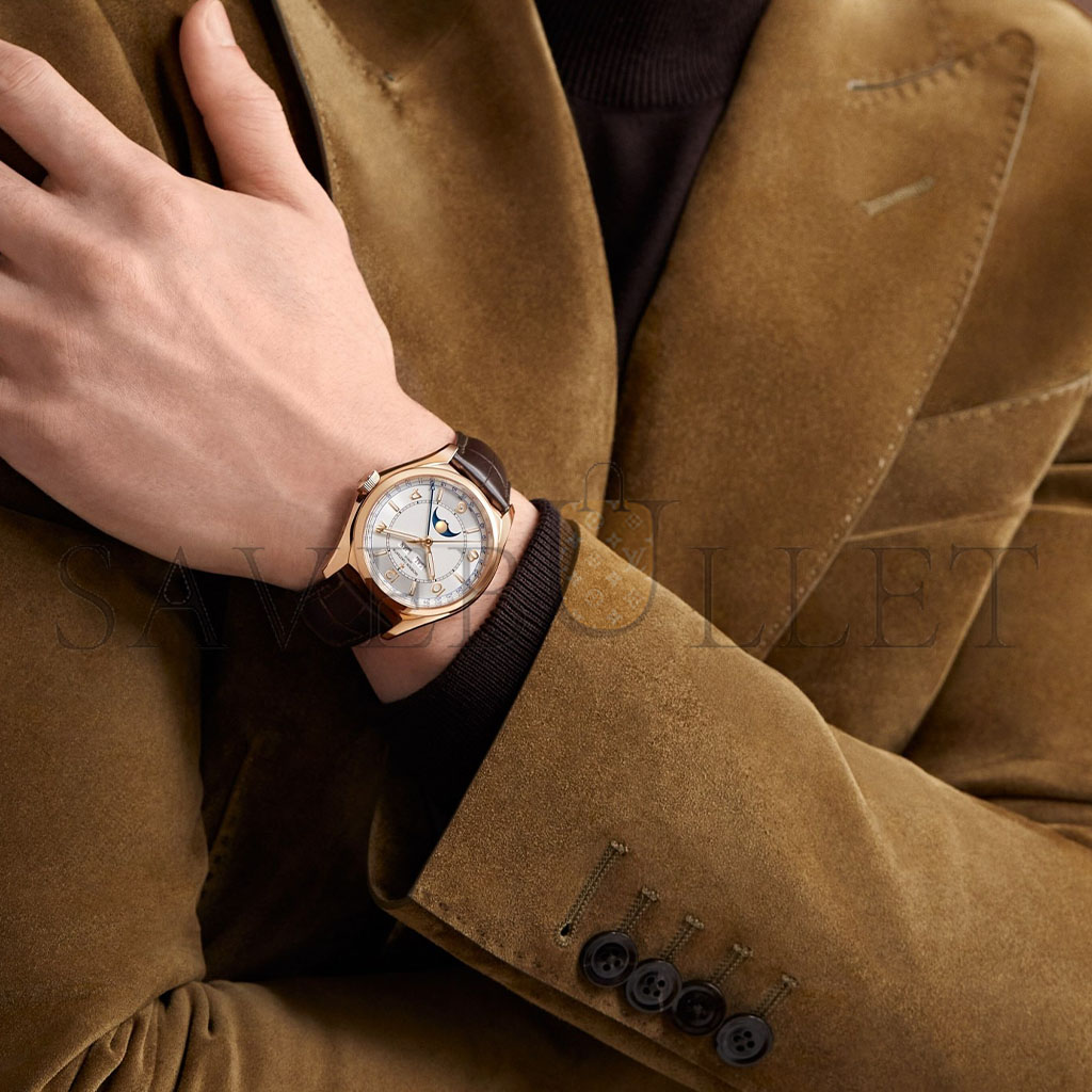 Heir to a model from 1956, this 18K pink gold watch features a precision moon phase that is accurate over 122 years. This poetic complication is finished with day, date, and month displays. The date display and hand are embellished with a blue that matches the moon disc. Its openworked caseback reveals an elevated oscillating weight in 22K gold, inspired by the Maltese cross.
